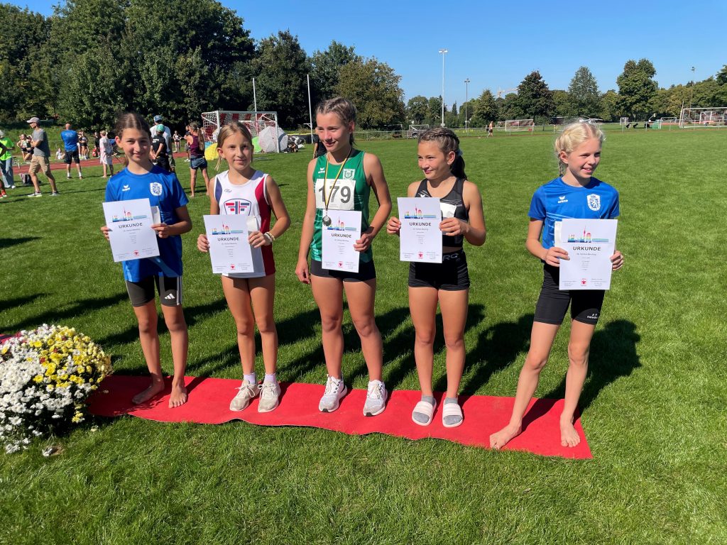 München, 21.09.2025: Ideales Herbstwetter, strahlender Sonnenschein und am Ende des Wettkampfes strahlende Gesichter bei Amelie Jimenez Gödderth, Hanna Lohse, Anna Peters und Juliane Steiner. In der Altersgruppe W 11 zeigten sich diese vier DJK-Mädchen nämlich zum Saisonabschluss im Dreikampf (50m, Weitsprung, Schlagballwurf) und 800-m-Lauf mit etlichen neuen persönlichen Bestleistungen nochmals von ihrer besten Seite.