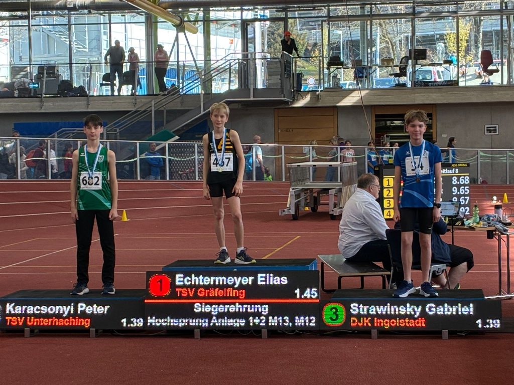 Allen voran macht Gabriel Strawinsky auf sich aufmerksam: im Hochsprung überquerte er souverän 1,39m, womit ihm der begehrte Sprung aufs Treppchen (3. Platz) gelang! Es folgten weitere tolle Platzierungen, über 60m Platz 6. in 8,84s, Weitsprung Platz 12 mit neuer Bestleistung 4,09m und Platz 14 über 800m in 2:56,07s!
